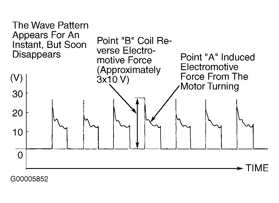 4. Using test harness, or backprobing, connect lab scope pick-up, in turn, to IAC motor connector terminals No. 1, 3, 4, and 6. With engine running, compare IAC motor waveform to normal waveform. See Fig 1.