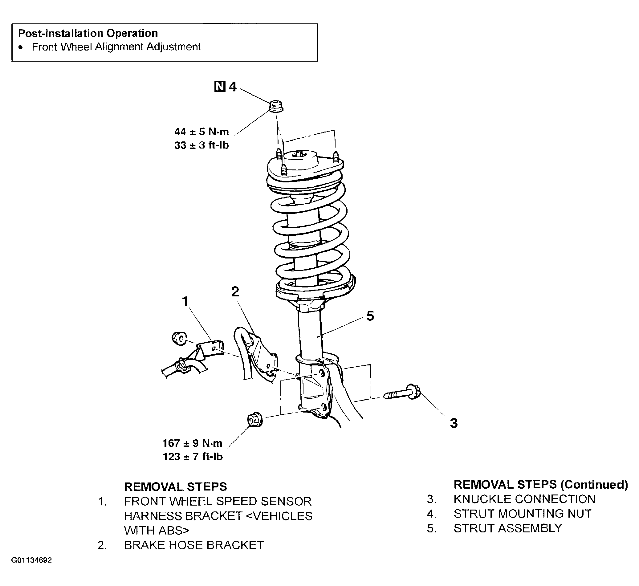 For strut assembly removal procedures, follow numbered steps in illustration. See Fig 1. For strut assembly installation procedures, follow numbers steps in illustration in reverse order.