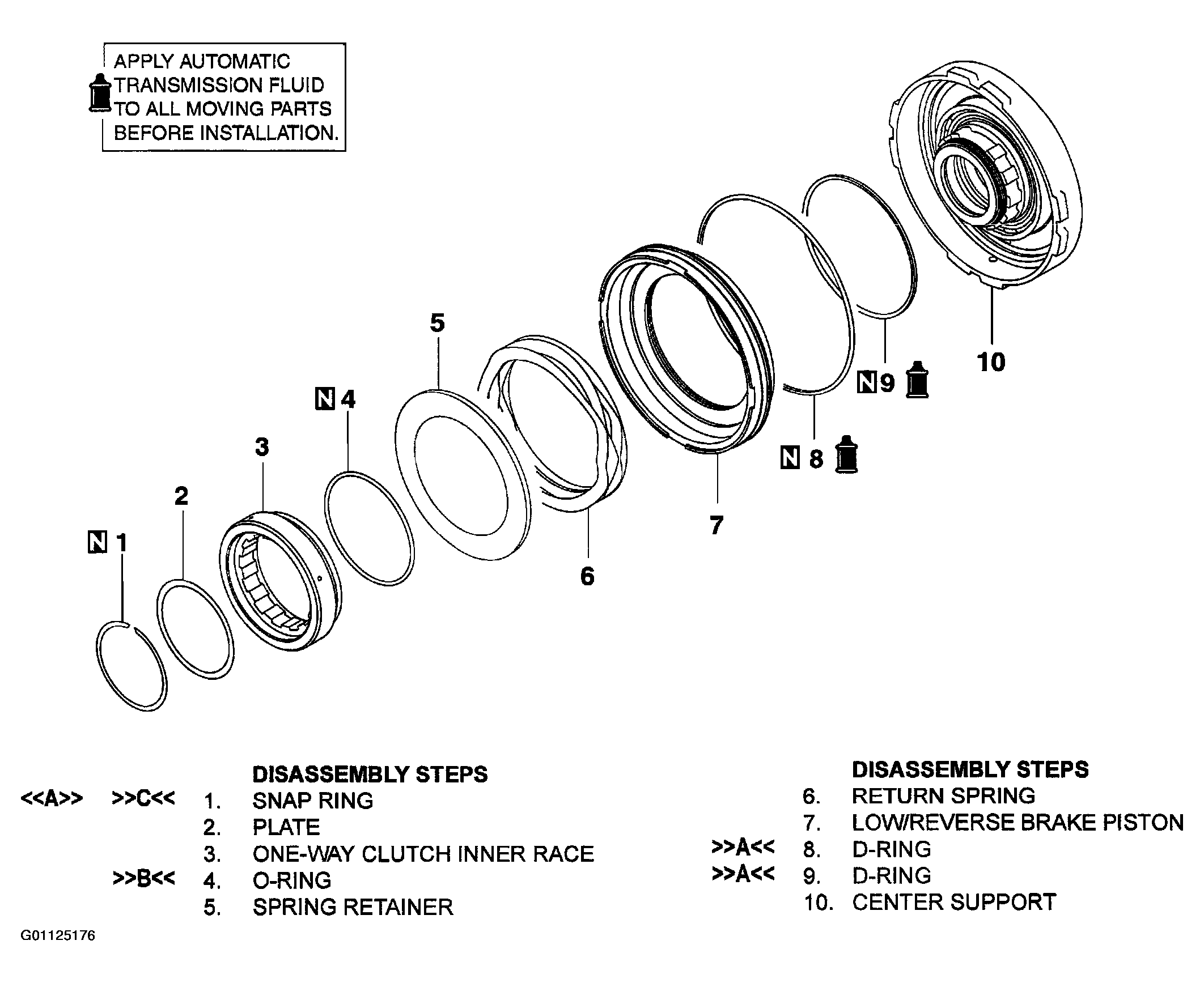 For center support disassembly procedures, follow numbered steps in illustration. See Fig 1. For center support assembly procedures, follow numbers steps in illustration in reverse order. Letters in illustration refer to service point to observe while disassembling and assembling center support. Letters with arrows pointing away from letter refer to service points to be observed while performing that step of the assembly procedure. See DISASSEMBLY SERVICE POINT . Letters with arrows pointing towards letter refer to service points to be observed while performing that step of the assembly procedure. See ASSEMBLY SERVICE POINTS .