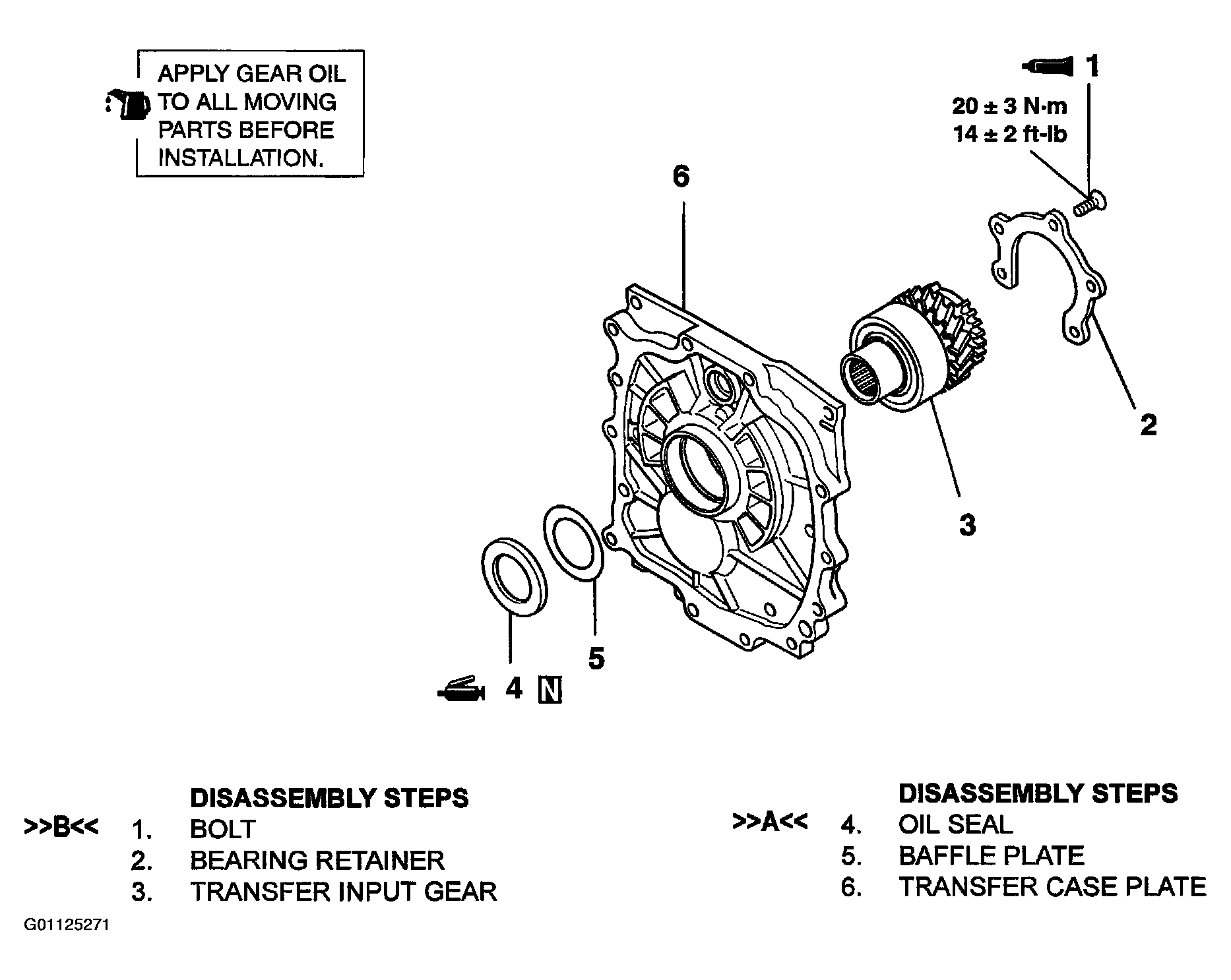 For transfer case plate disassembly procedures, follow numbered steps in illustration. See Fig 1. For transfer case plate assembly procedures, follow numbers steps in illustration in reverse order. Letters in illustration refer to service point to observe while disassembling and assembling transfer case plate. Letters with arrows pointing towards letter refer to service points to be observed while performing that step of the assembly procedure. See ASSEMBLY SERVICE POINTS .