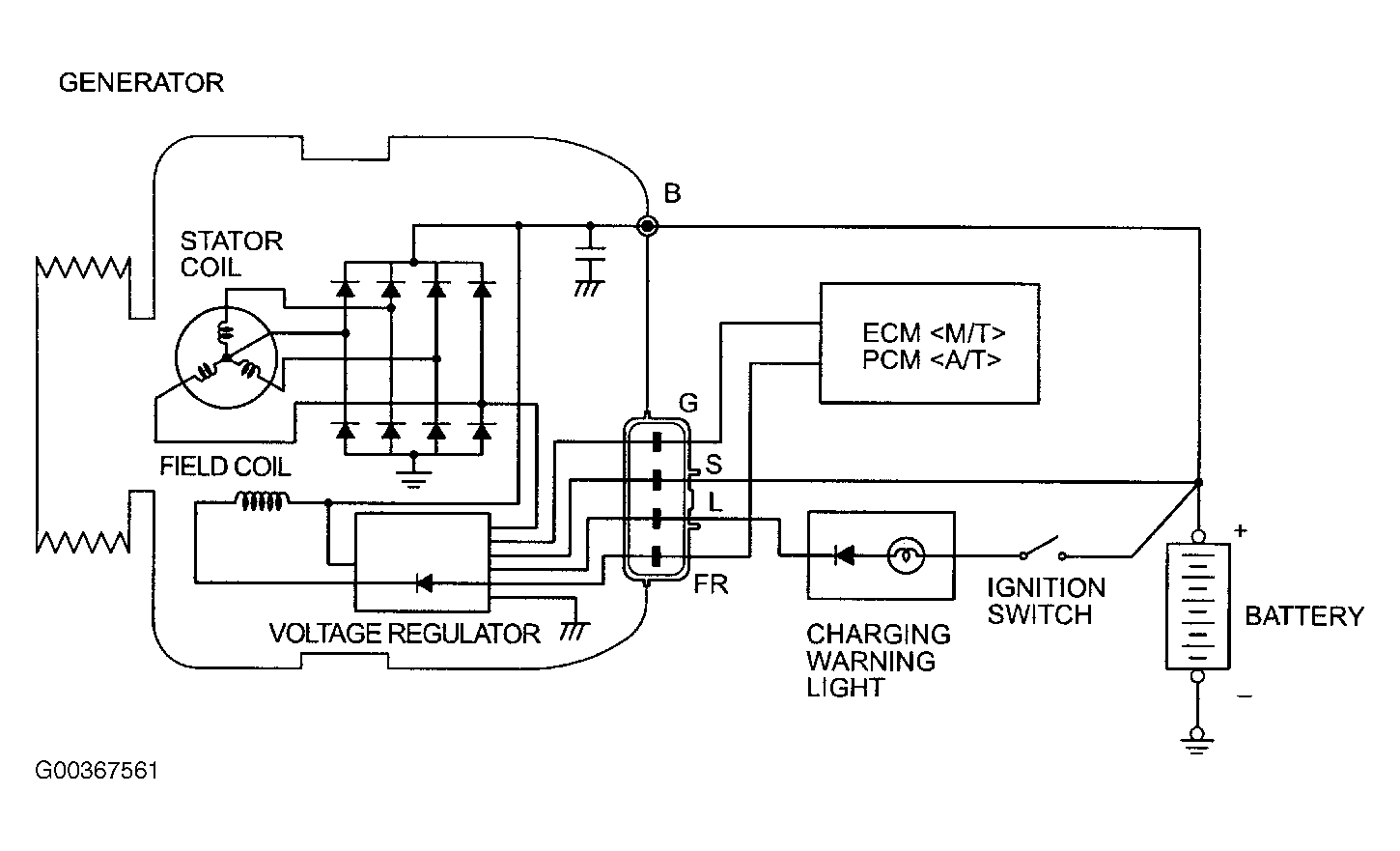 When the ignition switch is turned on, current flows in the field coil and initial excitation of the field coil occurs. When the stator coil begins to generate power after the engine is started, the field coil is excited by the output current of the stator coil. The generator output voltage rises as the field current increases and it falls as the field current decreases. When the battery positive voltage (generator S terminal voltage) reaches a regulated voltage of approximately 14.4V, the field current is cut off. When the battery positive voltage drops below the regulated voltage, the voltage regulator regulates the output voltage to a constant level by controlling the field current. In addition, when the field current is constant, the generator output voltage rises as the engine speed increases. See Fig 1 .