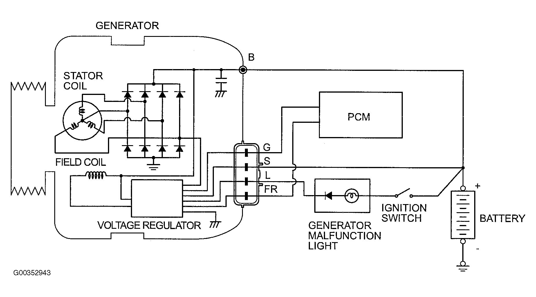 When the ignition switch is turned on, current flows in the field coil and initial excitation of the field coil occurs. When the stator coil begins to generate power after the engine is started, the field coil is excited by the output current of the stator coil. The generator output voltage rises as the field current increases and it falls as the field current decreases. When the battery positive voltage (generator S terminal voltage) reaches a regulated voltage of approximately 14.4V, the field current is cut off. When the battery positive voltage drops below the regulated voltage, the voltage regulator regulates the output voltage to a constant level by controlling the field current. In addition, when the field current is constant, the generator output voltage rises as the engine speed increases. See Fig 1 .