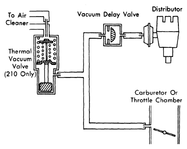 When the throttle valve in the carburetor or throttle chamber is opened rapidly, the Vacuum Delay Valve (VDV) restricts the air flow in the line to reduce the rate of vacuum change. See Fig 1. The reduced rate of vacuum change provides the vacuum advance unit with some delay time. When vacuum from the vacuum source decreases, the vacuum advance unit responds normally because a one-way function is provided by the valve.