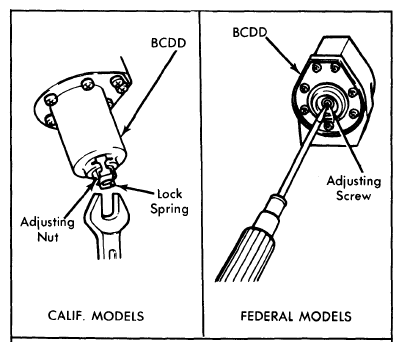 - If BCDD operating vacuum at idle is not as specified in BCDD OPERATING VACUUM table, turn adjusting screw/nut as necessary until specified operating vacuum is obtained. See Fig 1 and Fig 3.