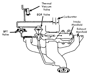 On 1977-79 models, exhaust gases flow out of exhaust manifold through EGR tube and into EGR control valve. The BPT valve, if equipped, monitors exhaust pressure in order to control intake manifold vacuum applied to EGR control valve. See Fig 1. The EGR control valve regulates actual amount of exhaust gas to be recirculated into the intake manifold. Operation of the EGR control valve is directed by the thermal vacuum valve which operates on carburetor vacuum and engine coolant temperature. The EGR system does not operate at idle or under full throttle (heavy load) conditions, when coolant temperature is low (thermal vacuum valve closed), or when exhaust pressure is low.