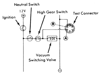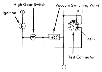 - Connect vacuum switching valve wire directly to battery positive terminal and recheck timing. Timing should change 5 degrees when wire is disconnected from battery. If not, replace high gear detecting switch. If timing does not change through entire test procedure, replace vacuum switching valve.
