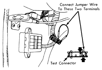 2. From inside vehicle, connect a jumper wire between test connector terminals. See Fig 1. Recheck ignition timing. System is functioning properly if timing does not change with jumper wire installed. If timing changes, check for a defective thermal vacuum switch.