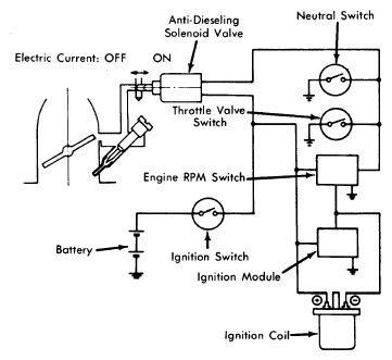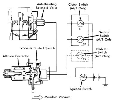 On Pickups, when intake manifold vacuum exceeds a pre-determined level deceleration, the fuel shut-off vacuum switch sends a signal to the anti-dieseling solenoid valve, shutting off fuel flow. See Figure. Whenever manifold vacuum is below this pre-determined level, the system is inoperative. The system is also controlled by the clutch switch and gear position switches (Neutral switch and inhibitor switch) so that system can be deactivated, even though vacuum is above the pre-determined level.