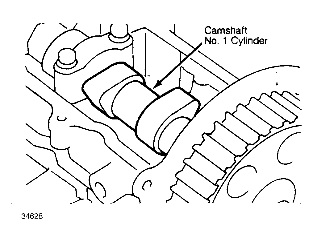 - Bring No. 1 cylinder to TDC on compression stroke. Ensure timing mark indicator and the notch in the crankshaft pulley are aligned. No. 1 cylinder camshaft lobes must be pointing up. See Fig 1 .