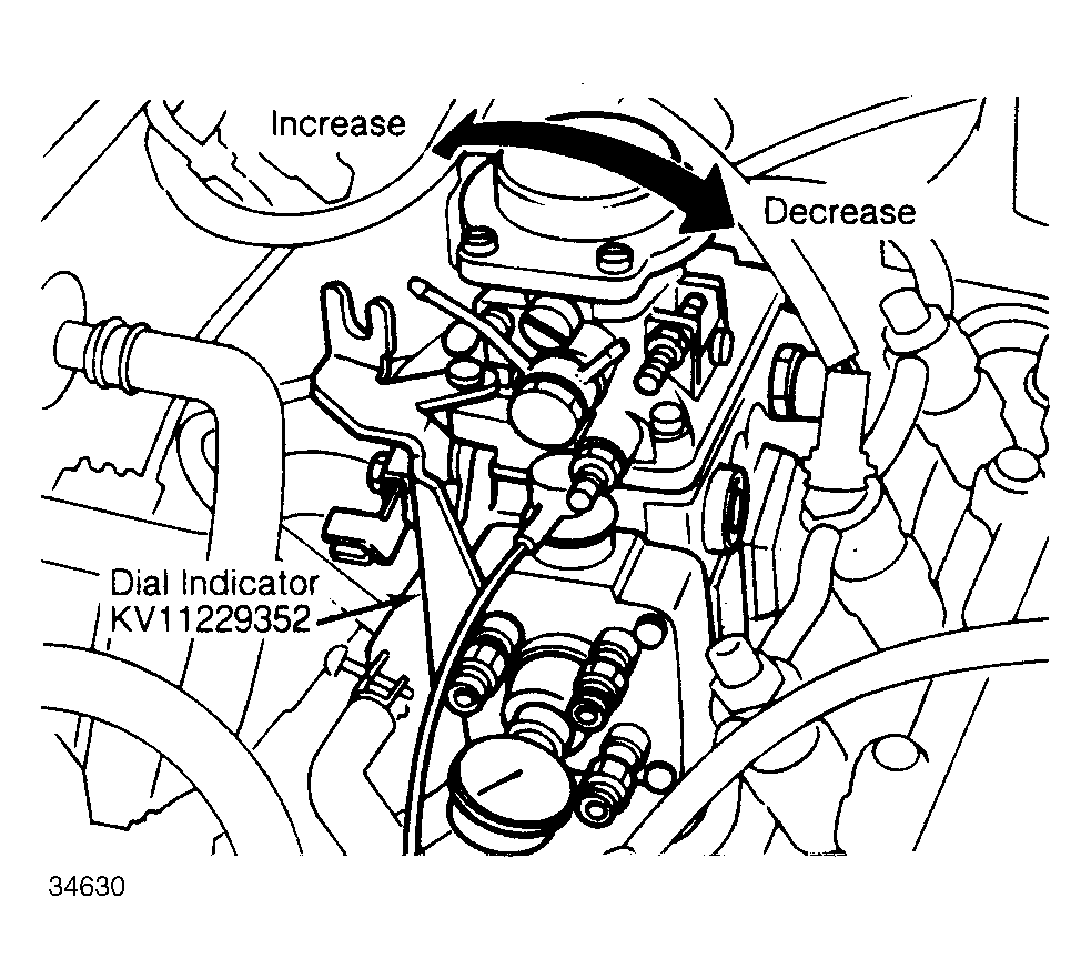 - Remove plug bolt from rear side of injection pump. Attach dial indicator and adapter (KV11229352) to measure pump plunger lift. Loosen pump nuts and bracket bolt. Turn crankshaft 15°-20° from TDC counterclockwise. Set dial indicator to zero. See Fig 2 .