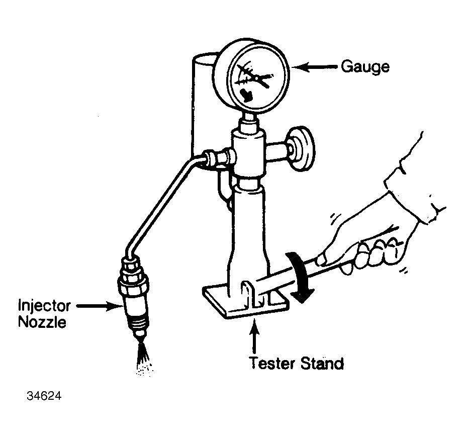 4. Service limit for new injectors is 1920-2033 psi (135-143 kg/cm2 ). Limit for used injectors is 1778-1920 psi (125-135 kg/cm2 ). If test pressure is outside limit, nozzle needs to be cleaned and adjusted.