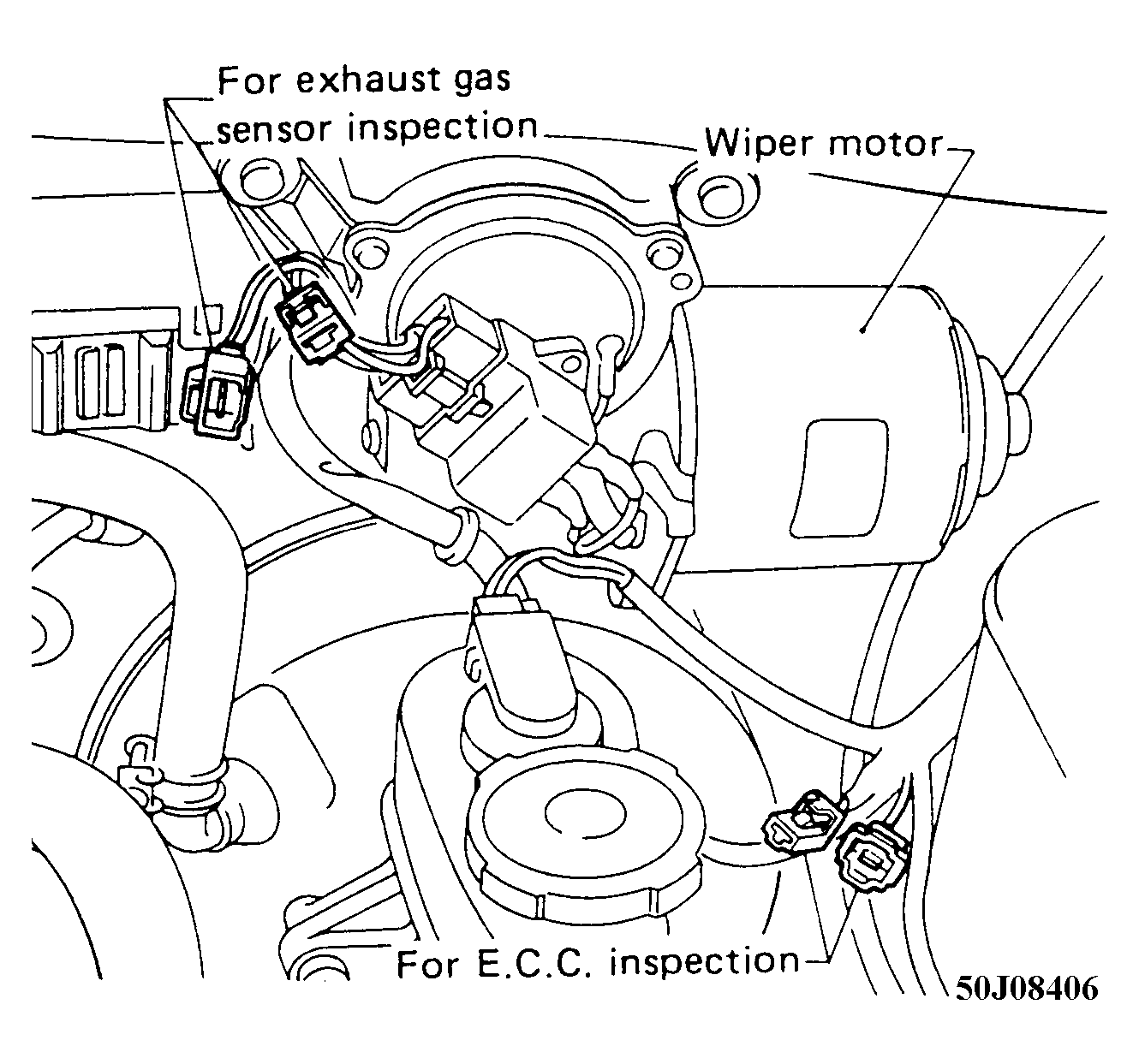 - Turn off engine and connect harness connector for ECC inspection and check inspection lamp for lighting interval. Leave exhaust gas sensor inspection connector connected.
