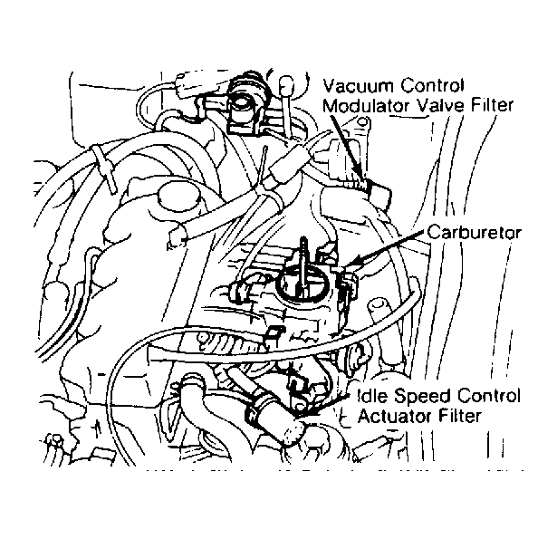 4. Apply about 8 in. Hg to vacuum control modulator input connector. Set vacuum gauge between control modulator and idle speed control actuator. Apply 12 volts to terminals of vacuum control modulator. Vacuum should read 1-2 in. Hg.