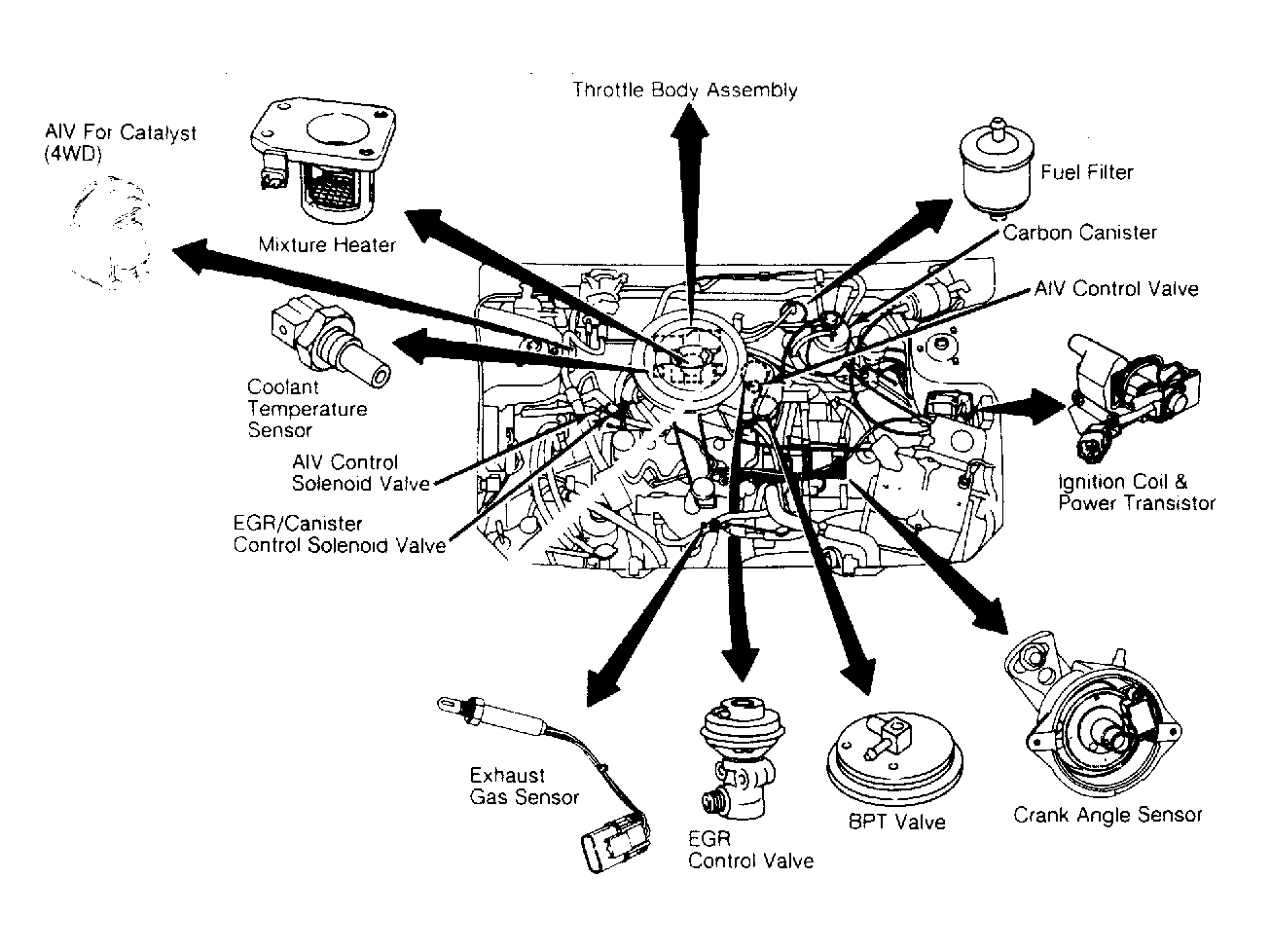 The Electronic Concentrated Engine Control System (ECCS) is a computerized emission, ignition, and fuel control system. A single Electronic Control Unit (ECU) accepts input voltage signals from a variety of input components. The ECU compares each of the voltage input signals to a preset parameter which is preprogrammed into the ECU. It instantly analyzes each of the input voltage values and adjusts output voltage signals accordingly. This allows the vehicle to perform at its optimum under a wide variety of operating conditions. All vehicles are equipped with different combinations of sensors and engine control components. See Figure . The sensors inputting information to the ECU include the following: