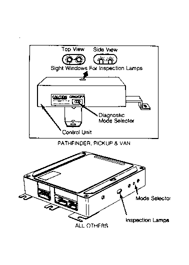 The ECU consists of a microcomputer, inspection lights, a diagnostic mode selector (or on/off switch), connectors and wiring for voltage signal input, voltage signal output and power supply. See Figure . The unit is not serviceable and should not be opened. Monitor lights are provided on side of unit so system operation can be checked. The control unit contains memory and logic circuits that enable it to interpret sensor inputs and control various engine systems. The ECU is located under the passenger seat.