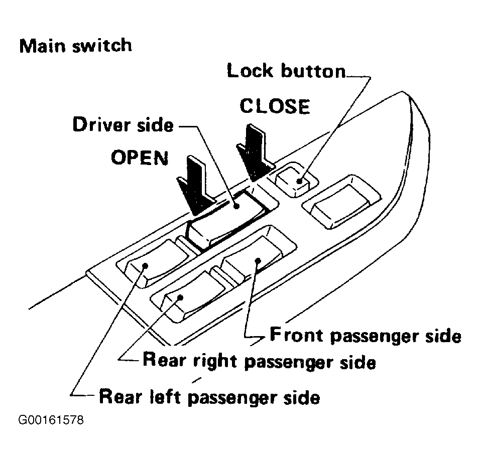 The power window operates when the ignition key is "ON". To open or close the window, press the switch and hold it down. The main switch (driver's switches) will open or close all the windows. See Fig 1 .