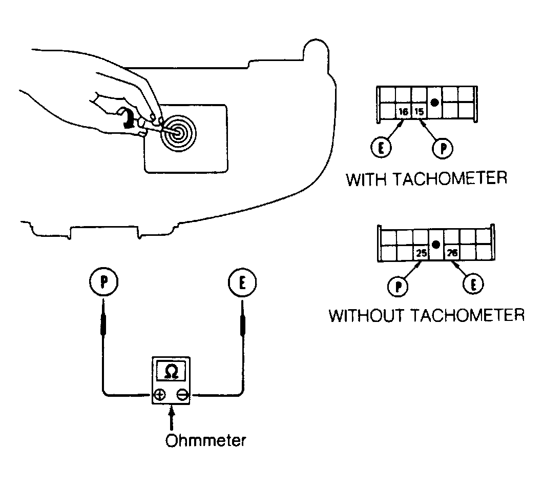 On NX and Sentra, remove instrument cluster to gain access to vehicle speed sensor. Slowly turn speedometer and check continuity of vehicle speed sensor circuit. Ensure continuity exists twice per turn. See Fig 1 . Also see appropriate ECU PIN VOLTAGE CHARTS in PIN VOLTAGE CHART S article.