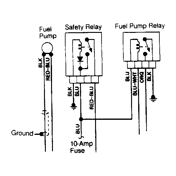 - Turn ignition on. Using a voltmeter, check for battery voltage at Blue wire of safety relay. See Fig 1 . If voltage is not present, check for blown 10-amp fuse or open circuit between fuse and relay.