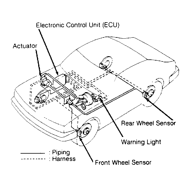 Anti-Lock Brake System (ABS) allows the driver to maintain steering control during heavy braking by fluctuating brakeline pressure. System consists of an Electronic Control Unit (ECU) with LED (for diagnostic usage), wheel speed sensors, actuator (electro-hydraulic unit) and an ANTI-LOCK warning light located in dash. See Fig 1 .