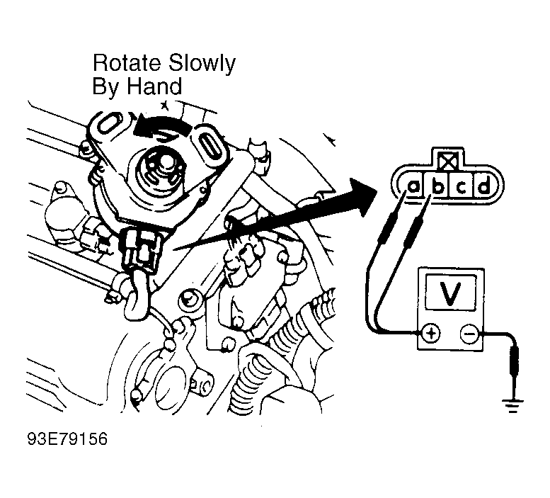 3. Measure voltages while rotating distributor by hand. Voltage should fluctuate 0-5 volts. If either voltage signal does not fluctuate 0-5 volts, check harness for short or open circuit. If no problems are found, replace CKP sensor.