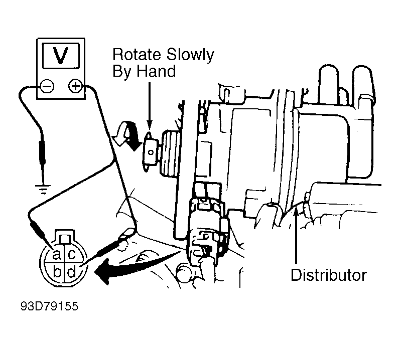 3. Measure voltages at both terminals while rotating distributor by hand. Voltage should fluctuate 0-5 volts. If either voltage signal does not fluctuate 0-5 volts, check harness for short or open circuit. If no problems are found, replace CKP sensor.