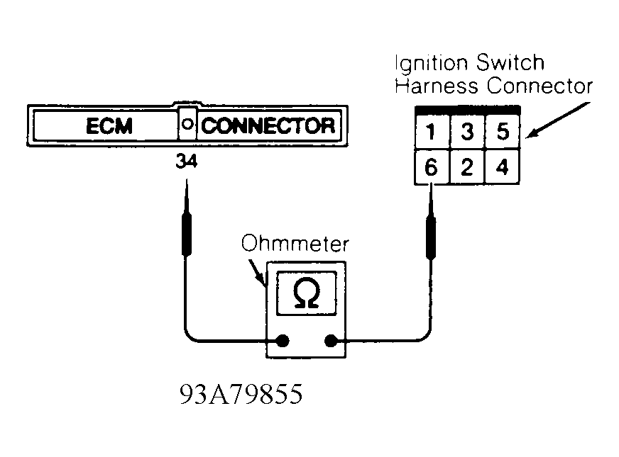 2. Turn ignition off. Disconnect ECM harness connector. Disconnect ignition switch harness connector. Check continuity between ECM harness connector terminal No. 34 (Green/Black wire) and ignition switch harness connector terminal No. 6 (Black/Yellow wire). Refer to Fig 1 . Continuity should exist. If continuity exists, check ECM and ECM harness connector terminals for correct installation, damage or corrosion. Repair as necessary. If continuity does not exist, repair open in harness or connectors between ignition switch and ECM harness connector.