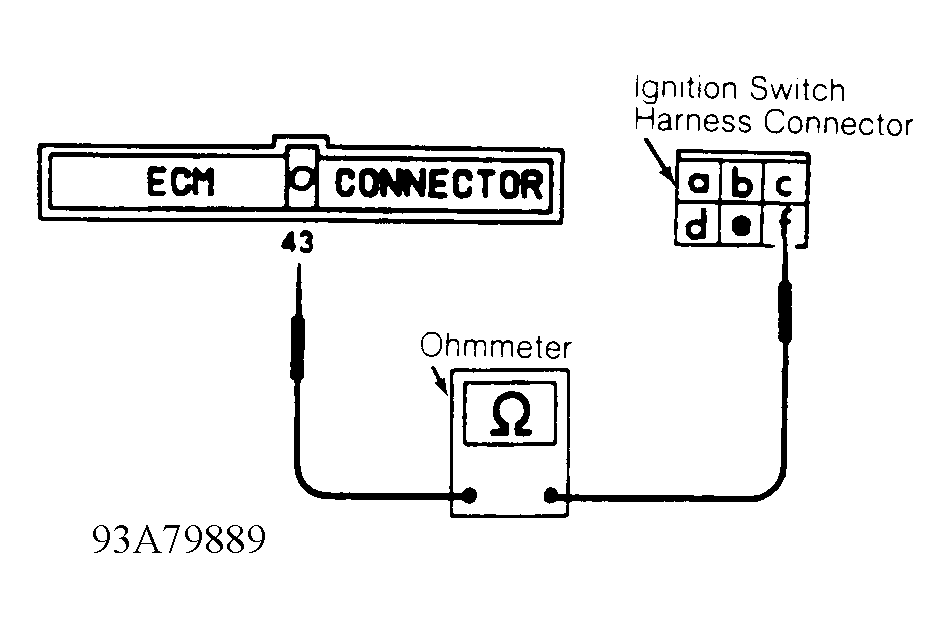 2. Turn ignition off. Disconnect ECM harness connector. Disconnect ignition switch harness connector. Check continuity between ECM harness connector terminal No. 43 (Green/White wire) and ignition switch harness connector terminal "f" (Green/Red wire). See Fig 1 . Continuity should exist. If continuity exists, check ECM and ECM harness connector terminals for correct installation, damage or corrosion. Repair as necessary. If continuity does not exist, repair open in harness or connectors between ignition switch and ECM harness connector.