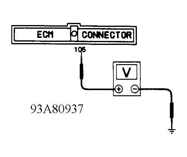 Start engine. Connect voltmeter between ECM terminal No. 105 and ground. See Figure and Figure . At 2000 RPM, battery voltage should be present. At 4000 RPM, .6-.8 volt should be present. If voltage is not as specified, go to next step. If voltage is as specified, inspect vacuum hose for clogging, cracks or bad connection. Repair vacuum hose as necessary.