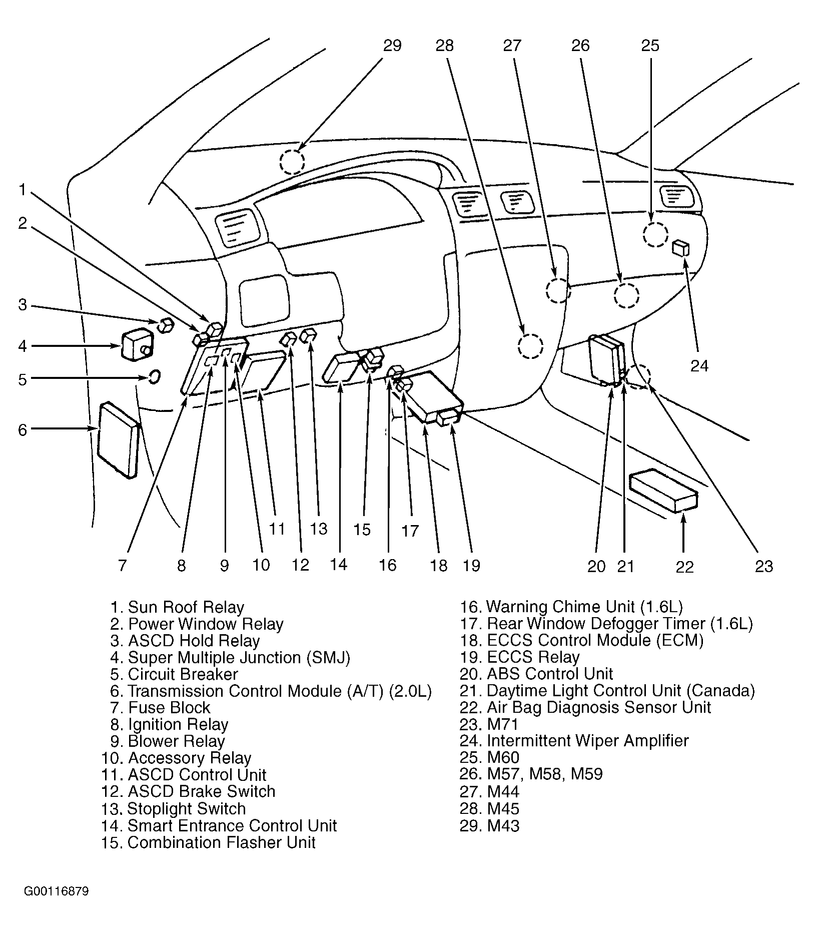 | ECCS Control Module (ECM) | Below center of dash. See Figure . |