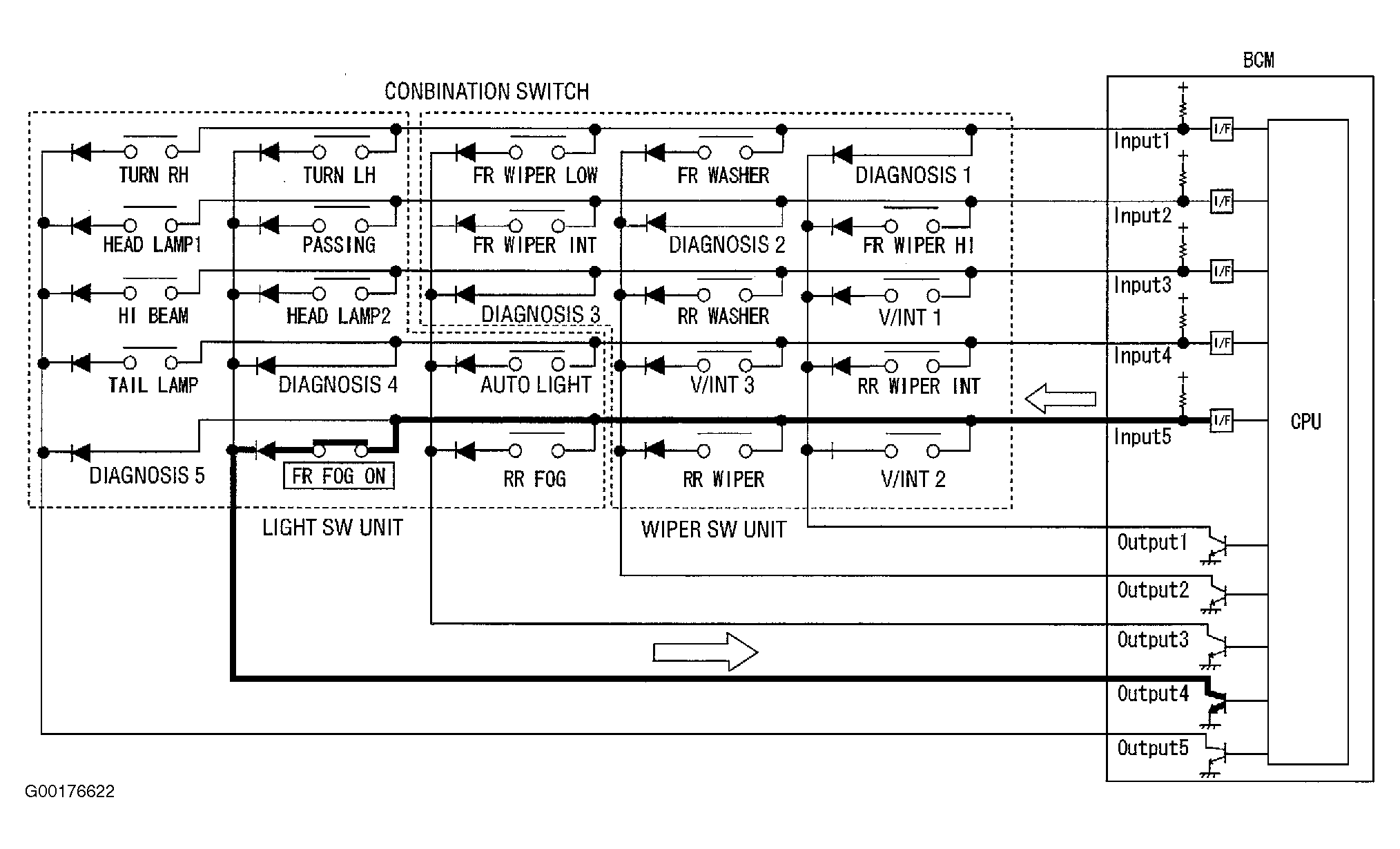 An example of this would be, when fog lamp switch is turned "ON", contact in combination switch turns "ON". At this time if OUTPUT 4 transistor is activated, BCM detects current flow in INPUT 5. When OUTPUT 4 transistor is "ON", BCM detects current flow in INPUT5, and judges fog lamp switch is "ON". Then BCM sends fog lamp "ON" signal to IPDM E/R using CAN communication. When OUTPUT 4 transistor is activated again, BCM detects current flow in INPUT 5, and confirms fog lamp switch is continuously "ON". See Fig 2 .