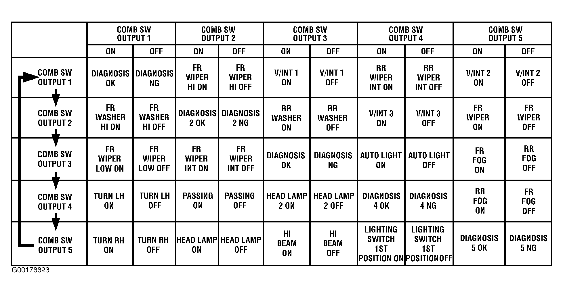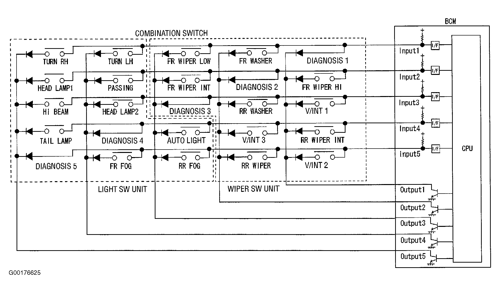 The BCM reads combination switch (light, wiper washer, turn signal) status, and controls various electrical components according to the results. The BCM reads information of 20 switches and 5 diagnostic results by combining 5 output terminals (OUTPUT 1-5) and 5 input terminals (INPUT 1-5). See Fig 1 .