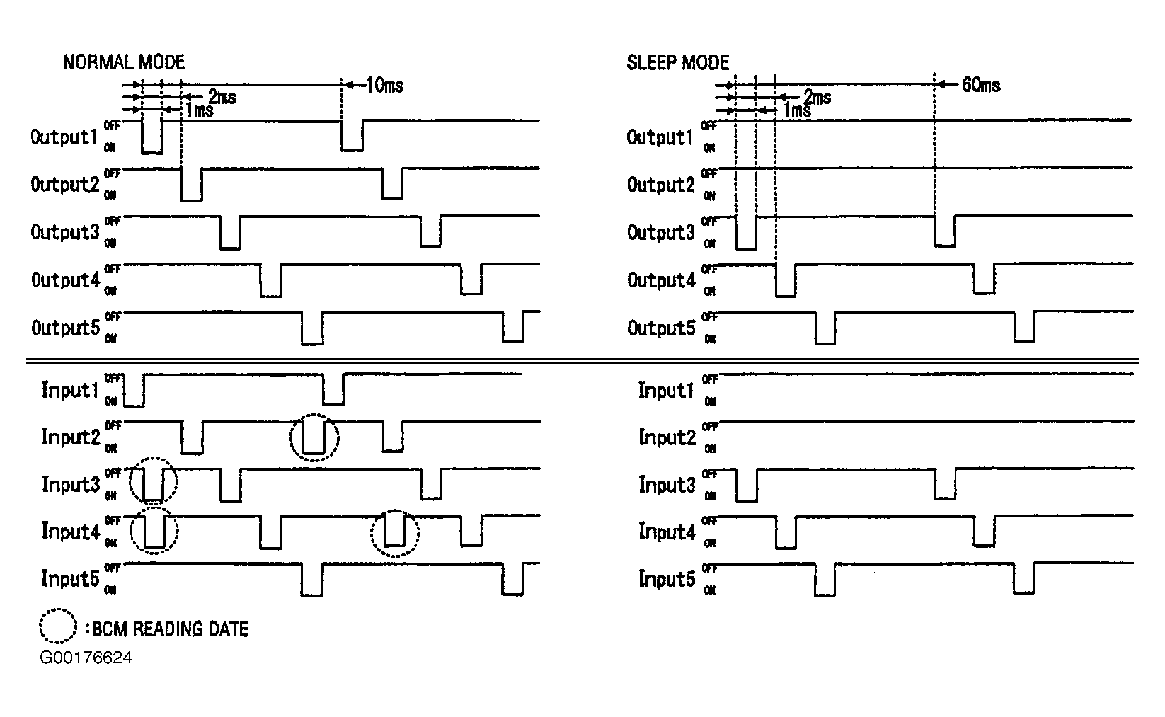 Combination switch reading function has operation modes as shown in Fig 4 . When BCM is not in sleep mode, each OUTPUT (1-5) terminal turns "ON-OFF" at 10 millisecond intervals. When BCM is in sleep mode, transistors of OUTPUT 1 and 2 stop the output, and BCM enters low-current-consumption mode. OUTPUTS (3-5) turn "ON-OFF" at 60 millisecond intervals, and receives lighting switch input only.