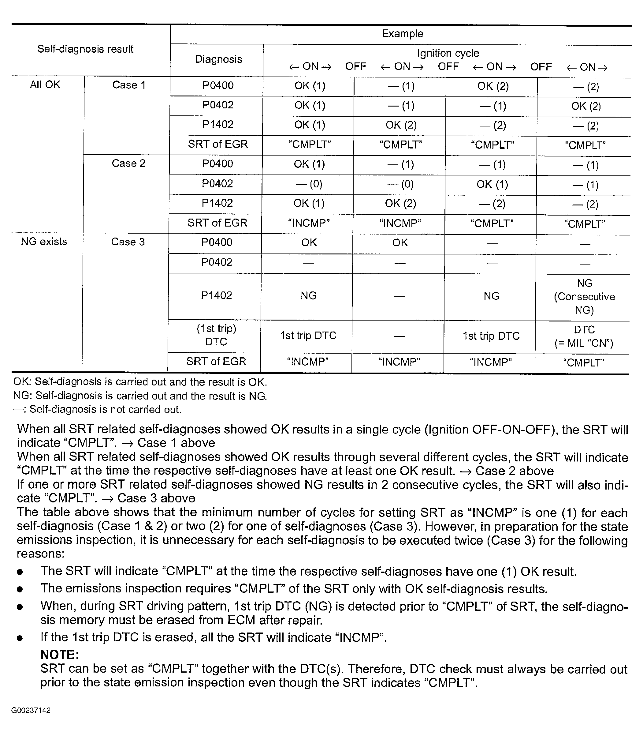 SRT is set as "CMPLT" after self-diagnosis has been performed 1 or more times. Completion of SRT is done regardless of whether the result is "OK" or "NG". The set timing is different between "OK" and "NG" result. See Fig 1.