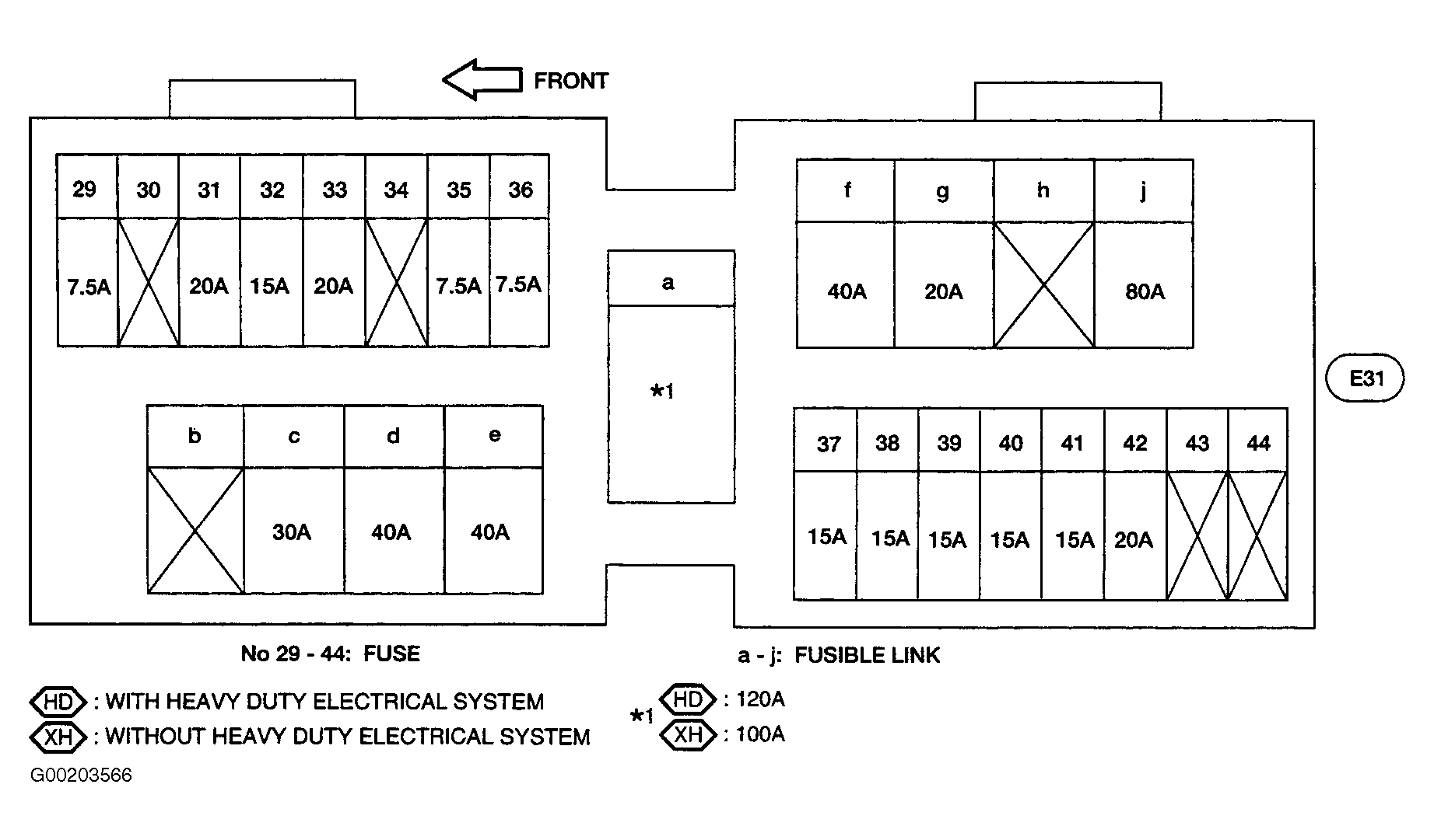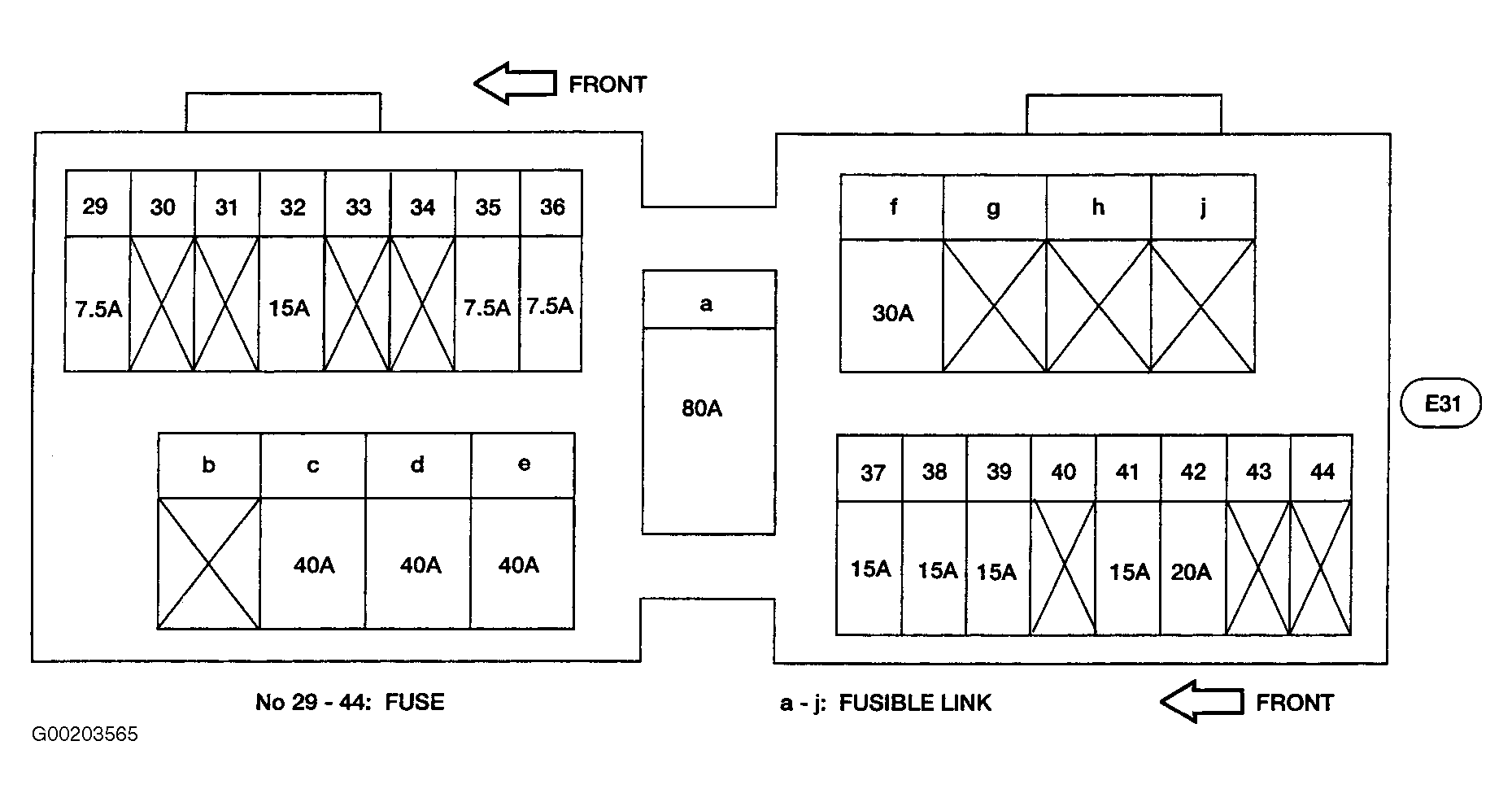 Fuse and fusible link box is located underhood. See Fig 3 . To identify components on fuse and fusible link box, see Fig 5 or Fig 6 .