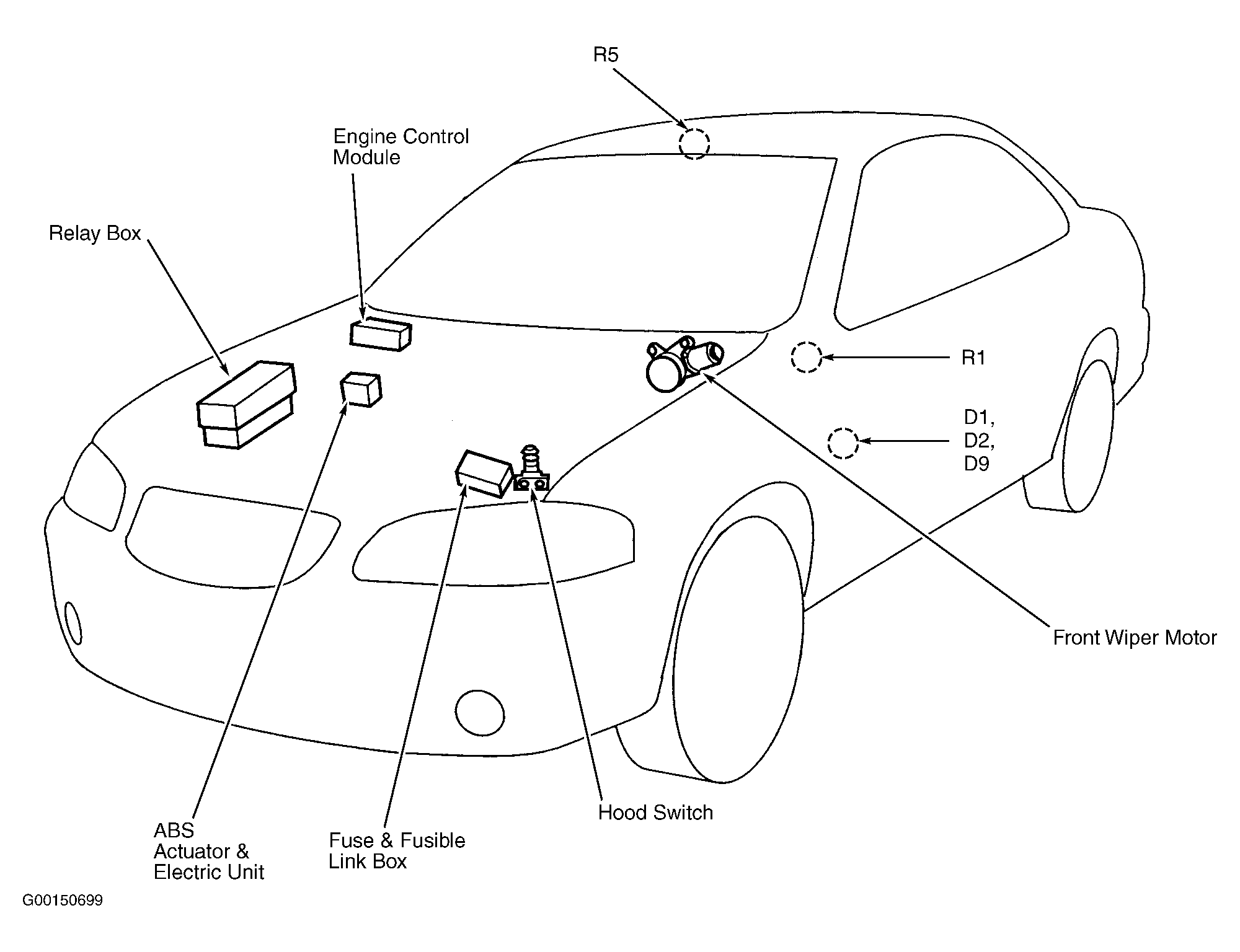ABS Actuator & Electric Unit At right rear of engine compartment. See Figure.