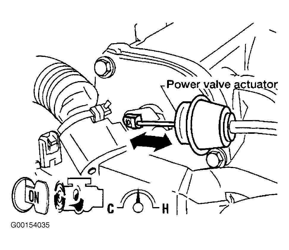 4. Start engine and warm to normal operating temperature. While quickly increasing engine speed to 5000 RPM, check if power valve actuator rod moves. See Fig 1 and Fig 2 . If rod moves, system is okay. If rod does not move, go to next step.