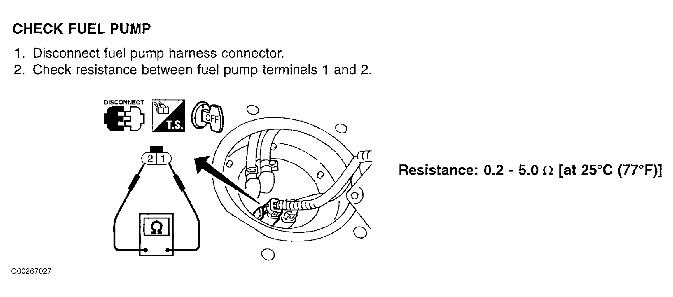 Disconnect fuel pump harness connector. For location, see FUEL PUMP HARNESS CONNECTOR LOCATIONS  table. On Frontier 2.4L, measure resistance between fuel pump connector terminals No. 5 and 6. See Fig 1. On Maxima and Sentra, measure resistance between fuel pump connector terminals No. 1 and 3. See Fig 2. On all other models, measure resistance between fuel pump 2-pin connector terminals See Fig 3. On all models except Murano and 350Z, resistance should be 0.2-5.0 ohms at 77°F (25°C). On Murano and 350Z, resistance should be approximately 1.0 ohms at 77°F (25°C). Replace fuel pump, if resistance is not as specified.