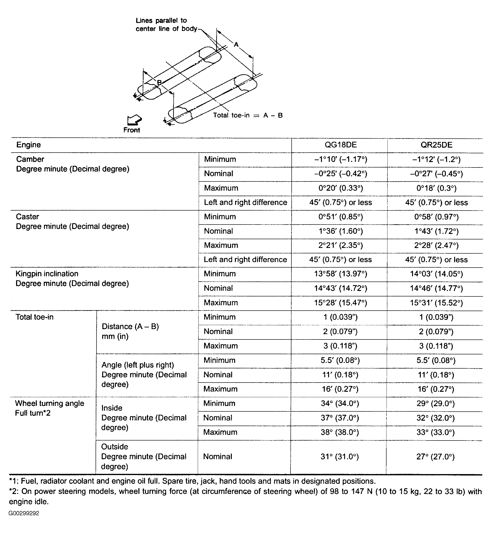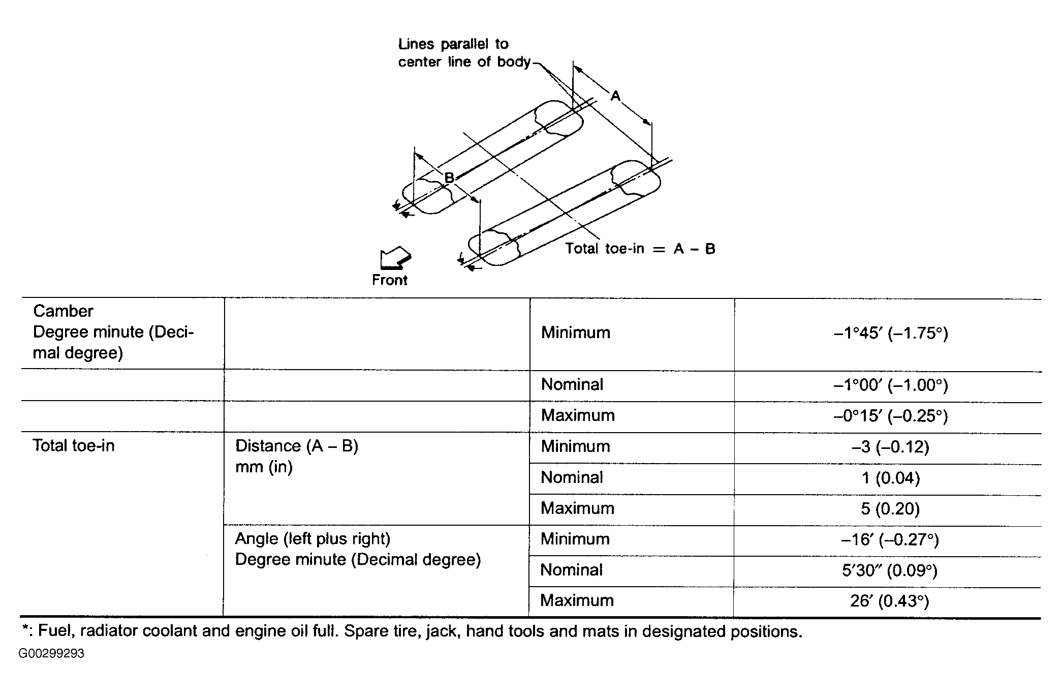 Use illustrations for front and rear wheel alignment specifications. See Fig 1 and Fig 2 .