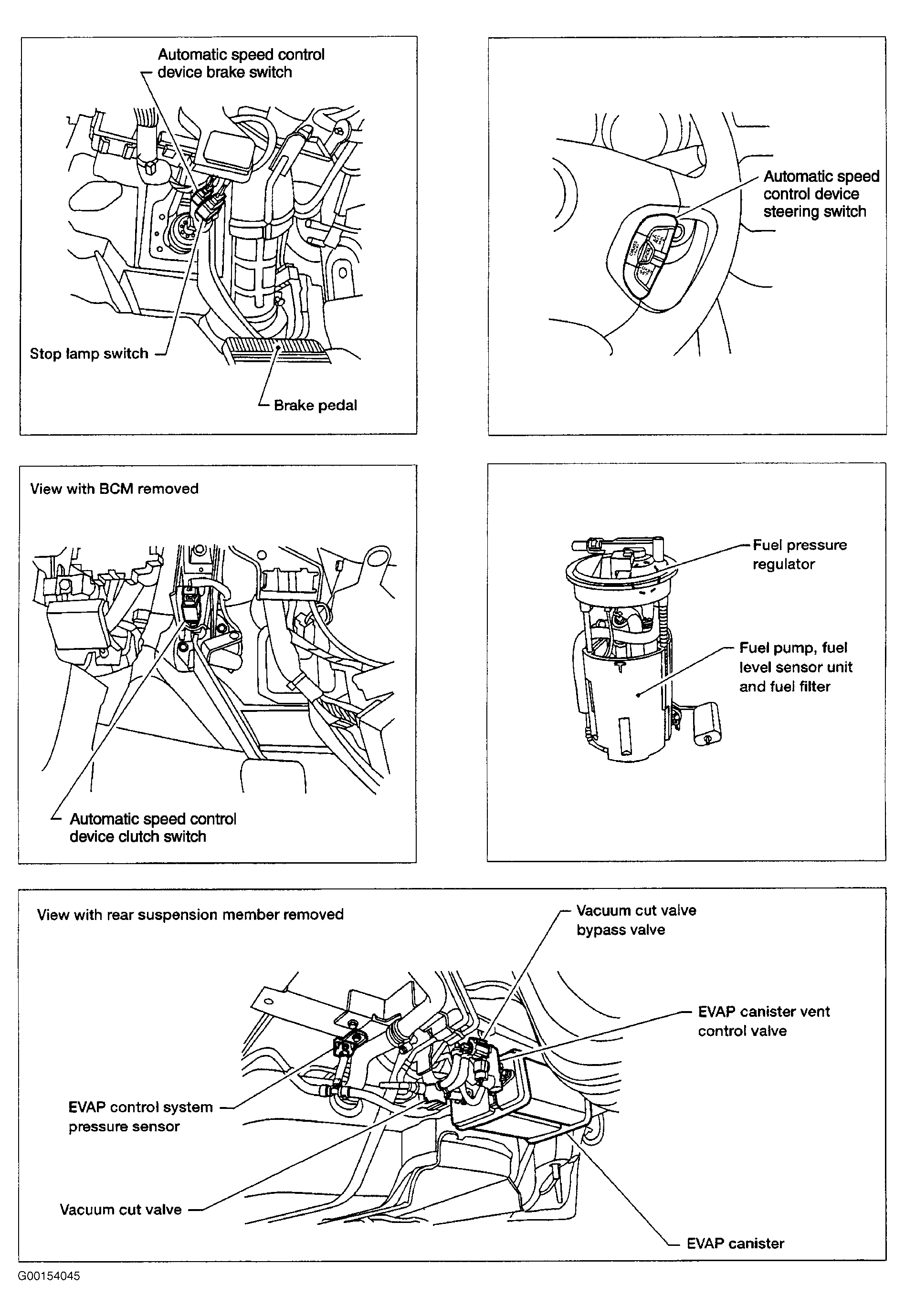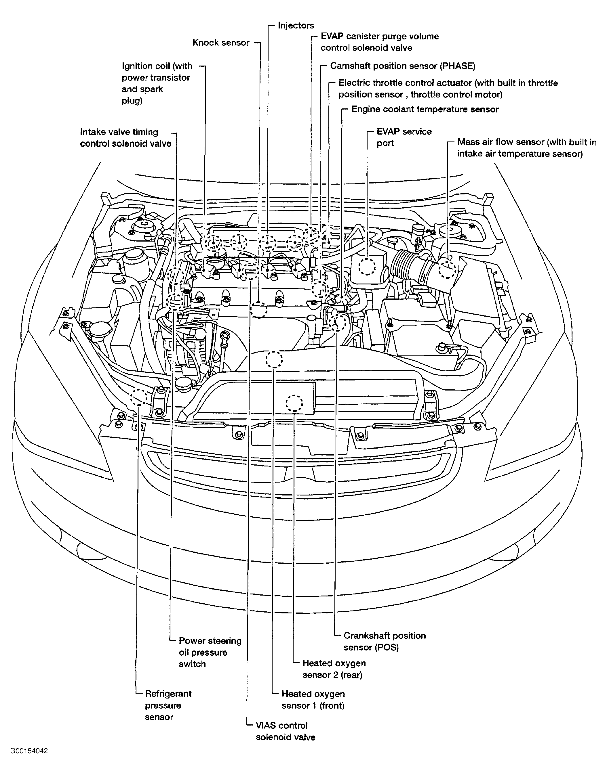 For engine control system component locations, see Figure-Figure . ECM is located behind glove box. For ECM connector and terminal view, see Figure. For removal and installation of components, see appropriate REMOVAL & INSTALLATION article.