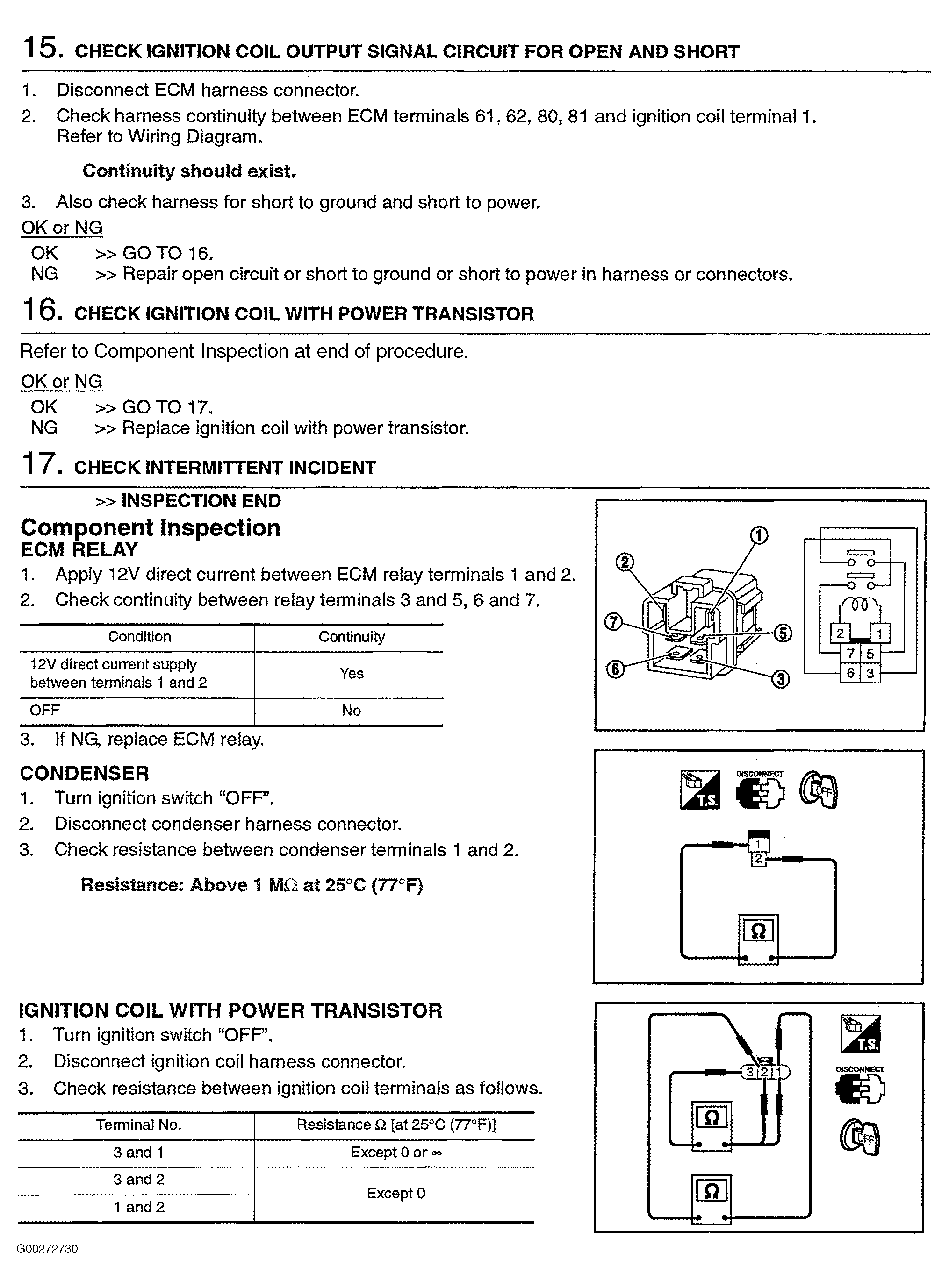 For ignition signal circuit system and component testing, see Fig 1-Fig 11 . For diagnosis of ECM power supply circuit, see POWER & GROUND CIRCUITS (SENTRA 1.8L) . For intermittent problem, see INTERMITTENTS in TROUBLE SHOOTING - NO CODES article.