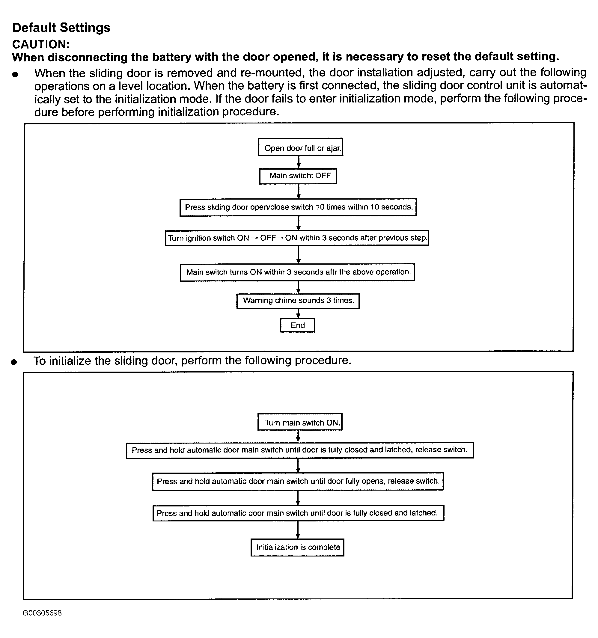 On Quest models, some power sliding door (if equipped) functions may become disabled after the battery is disconnected and/or power supply is interrupted. Perform the following initialization procedure to restart the power sliding door so that all functions are enabled. See Fig 1.