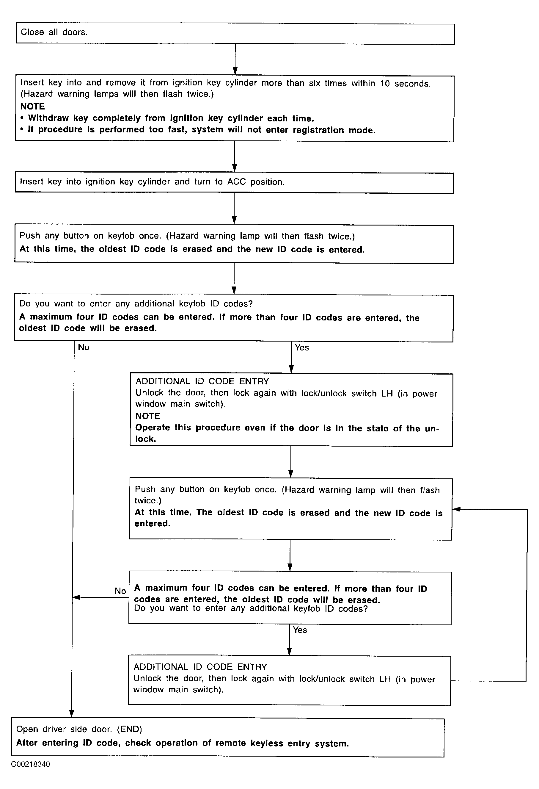 NOTE: If a keyfob is lost, the ID code of the lost keyfob must be erased to prevent unauthorized use. A specific ID code can be erased with CONSULT-II. However, when the ID code of a lost keyfob is not known, all keyfob ID codes should be erased. After all ID codes are erased, the ID codes of all remaining and/or new keyfob must be re-registered. To erase all ID codes in memory, register one ID code (keyfob) 4 times. After all ID codes are erased, the ID codes of all remaining and/or new keyfob must be re-registered. When registering an additional keyfob, the existing ID codes in memory may or may not be erased. If 4 ID codes are stored in memory, when an additional code is registered, only the oldest code is erased. If less than 4 ID codes are stored in memory, when an additional ID code is registered, the new ID code is added and no ID codes are erased. If you need to activate more than 2 additional new keyfobs, repeat the procedure for each new keyfob.