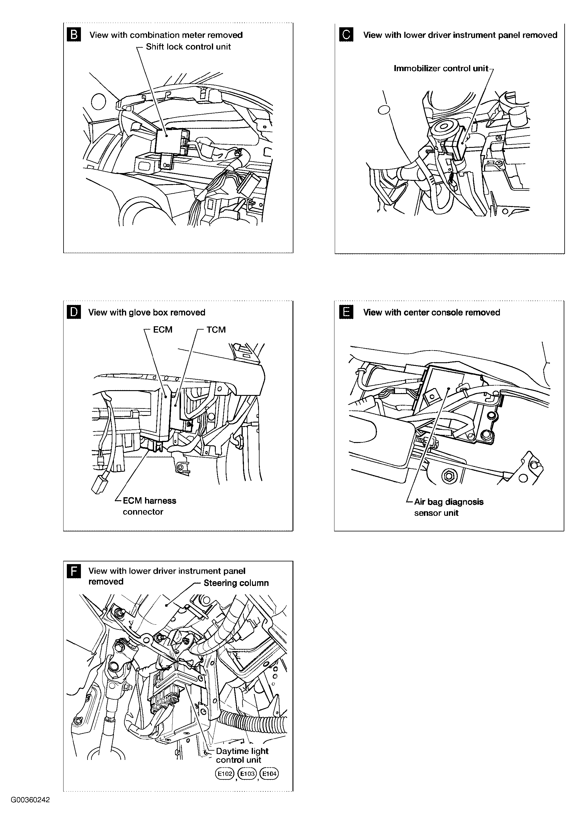 Air Bag Diagnosis Sensor Unit Below center console, between seats. See Figure .