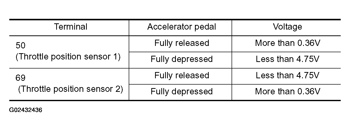 - Check voltage between ECM terminals 50 (TP sensor 1 signal), 69 (TP sensor 2 signal) and ground under the conditions listed in Fig 1.