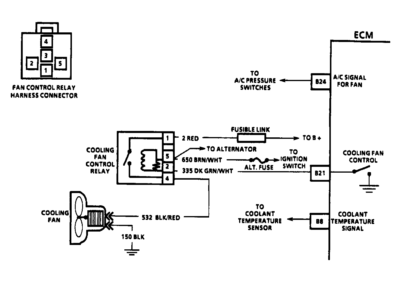 - Disconnect cooling fan relay harness connector. Using an ohmmeter, check continuity of relay winding. See Figure-62. Continuity should exist. Check continuity across power delivery terminals of relay. With relay not energized, no continuity should exist.