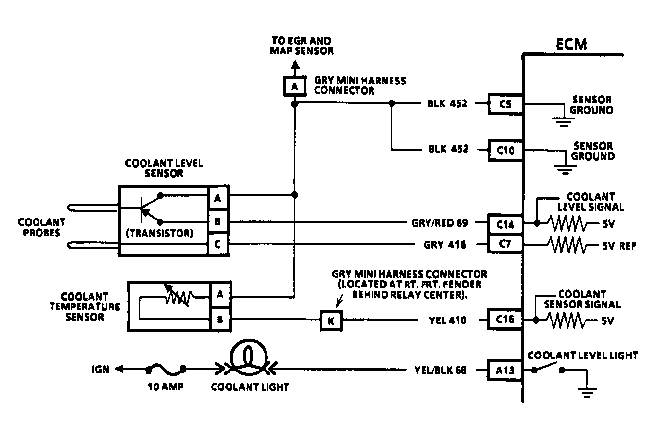 - Disconnect ECM connector containing coolant level light driver terminal. Turn ignition on. Using a jumper wire, ground ECM coolant level light driver terminal. If light does not illuminate, check for an open in the coolant level light circuit, including a bad bulb. If light does illuminate, ECM driver is faulty.
