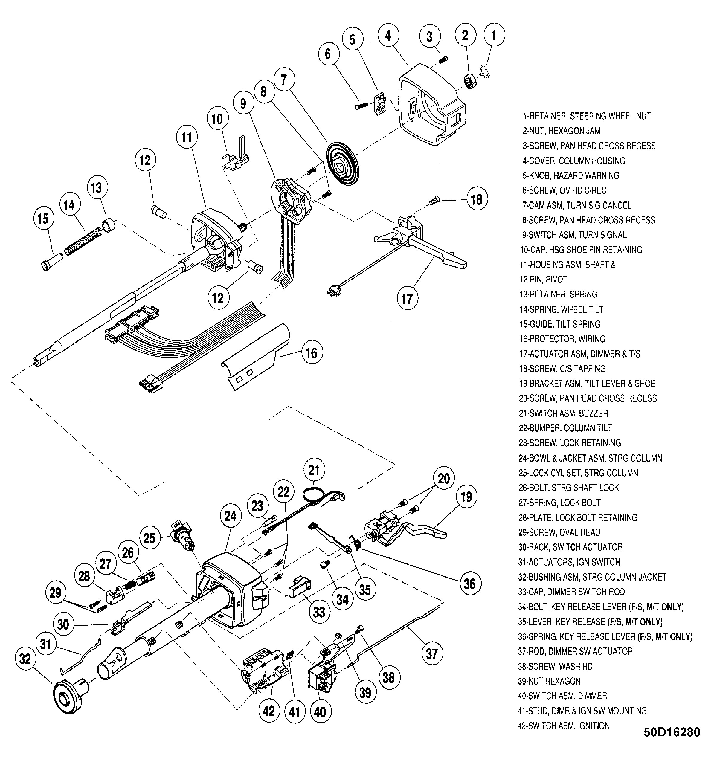 Steering column design is basically the same for all columns, with the main differences involving the addition of column shifters and tilt or tilt/telescopic mechanisms. Steering columns use an integral ignition lock switch. This lock secures the steering wheel and shift linkage (column shift).