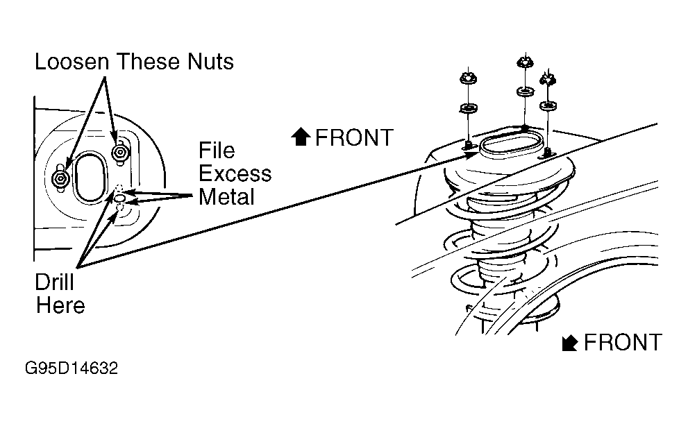 - Drill 13/32" holes at each strut stud hole, then file excess material between holes to create an elongated slot. Lower vehicle to install strut into tower. Adjust caster to specification by moving top of strut forward or rearward. See WHEEL ALIGNMENT SPECIFICATIONS
