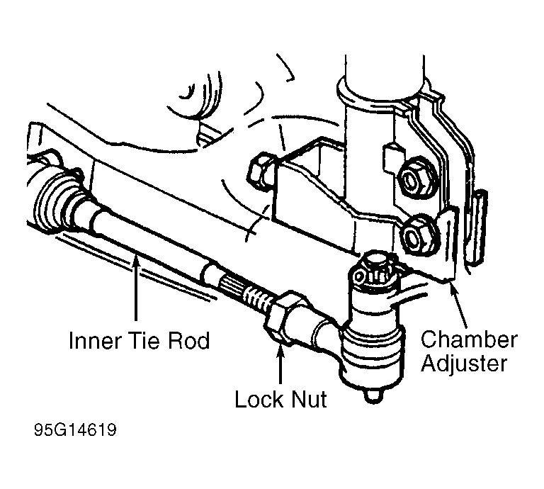 Loosen lock nut on tie rod. See Figure . Rotate inner tie rod as necessary until full toe-out position is obtained, then rotate inner tie rod until rear toe-in is as specified. See WHEEL ALIGNMENT SPECIFICATIONS . Tighten lock nut to specification. See TORQUE SPECIFICATIONS.