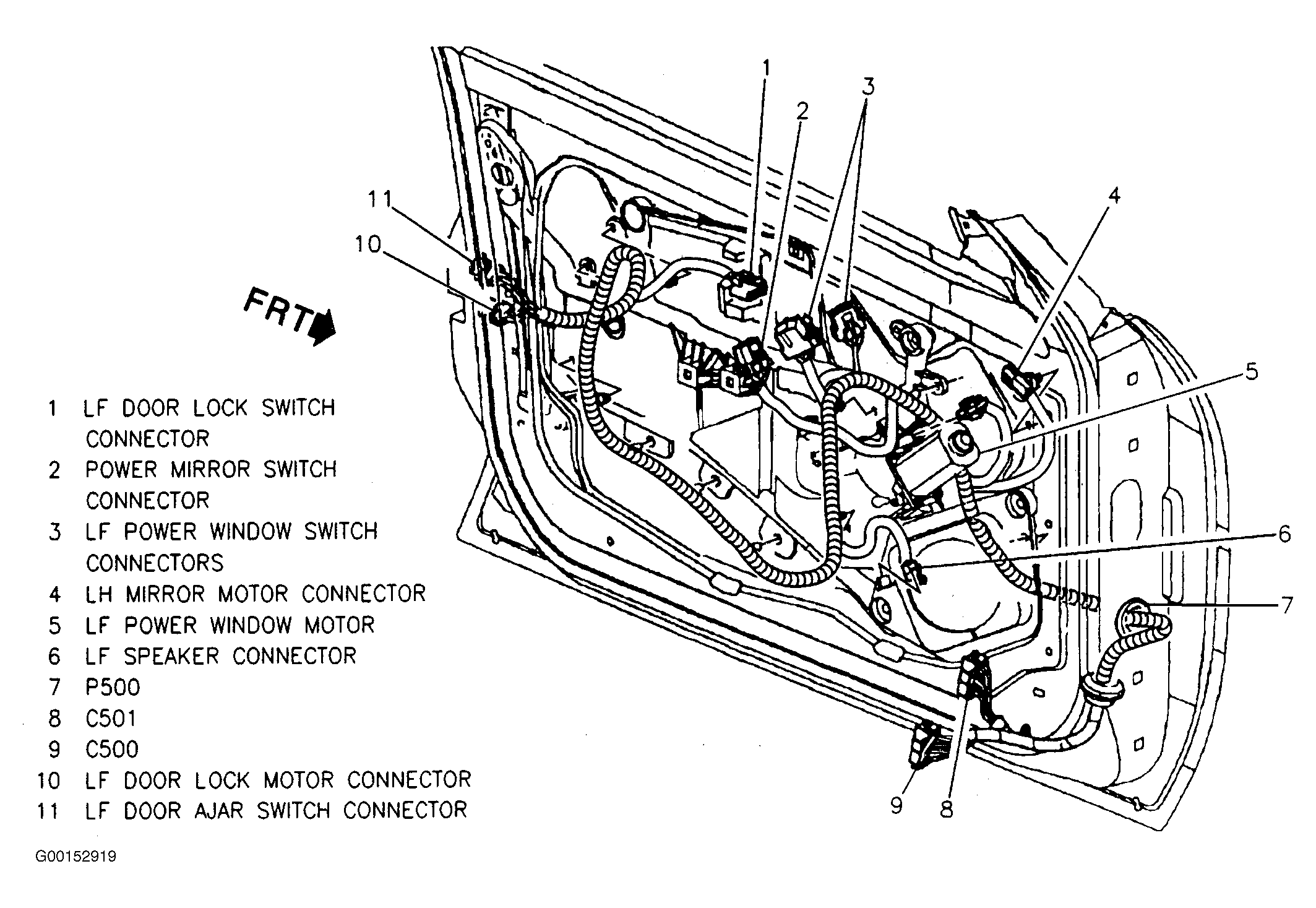 Fig 2: Left Front Door Wiring Harness Routing - Mirror Switch, Mirror Motor, & Connectors C500 & C501